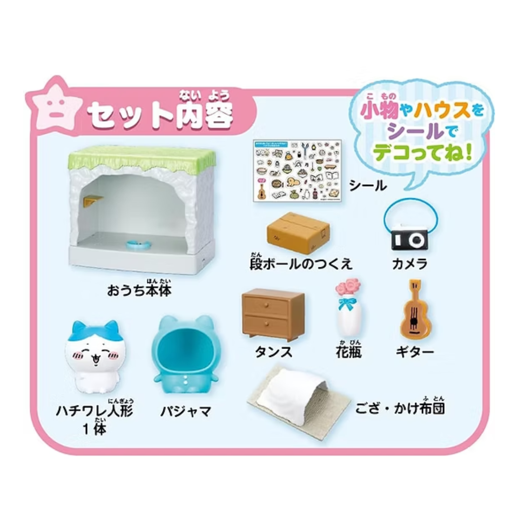 附有豐富的配件,包含有小八辛苦存錢買到的相機、超可愛睡衣,可以幫小八穿戴在身上互動,另外還有可以鑽進去躺躺的小被窩、唱片尾曲時用的吉他、小櫃子、花瓶與吃消夜和學習時使用的紙箱書桌等道具,生動賞玩劇中的情境家家酒~另外,還有多種道具小貼紙,可以貼在牆壁上當作裝飾!快來布置小八貓寶寶的家吧!