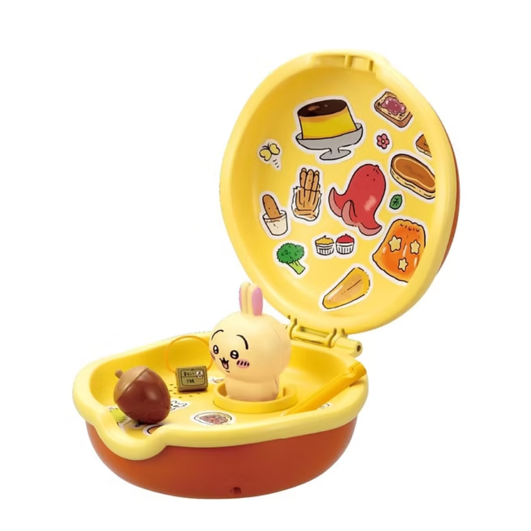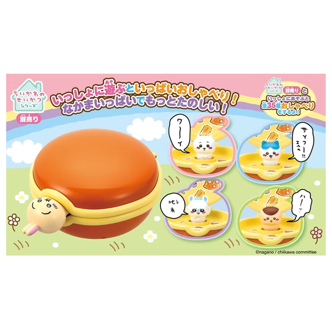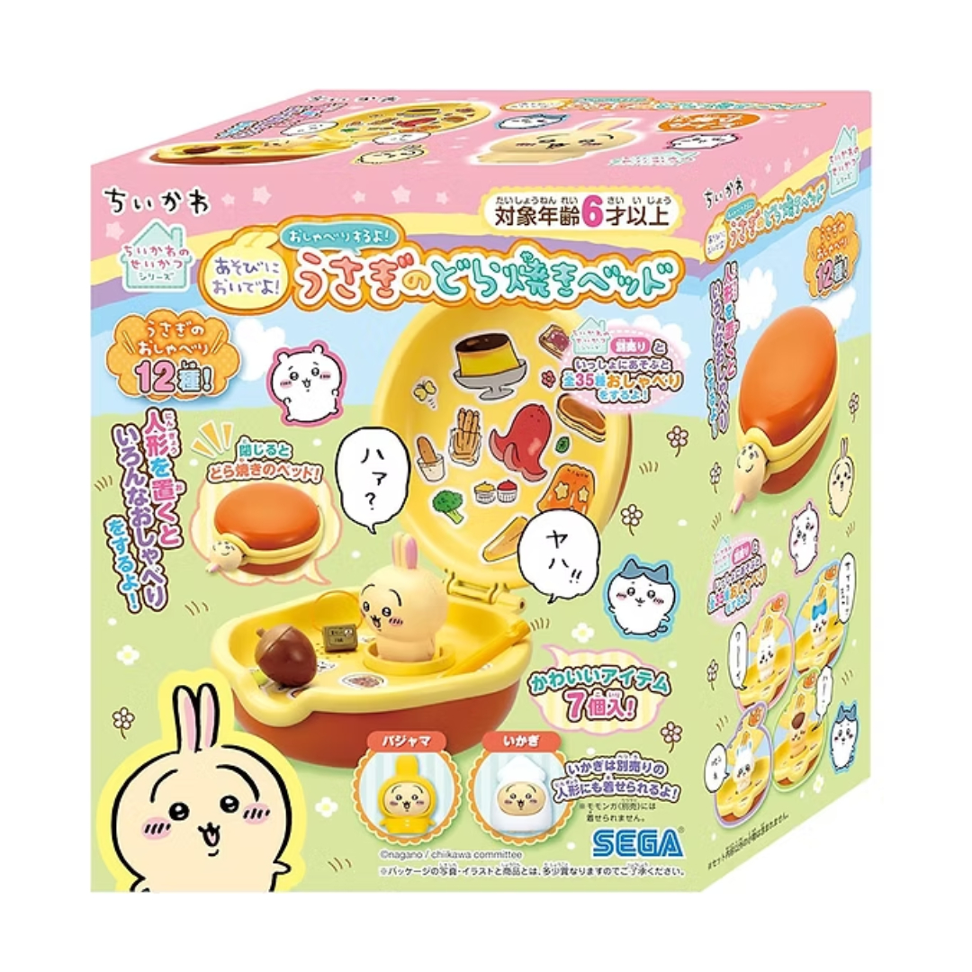 「吉伊卡哇快來玩吧!來聊天吧!兔兔的銅鑼燒床」玩具娃娃屋,以原作中兔兔把大型銅鑼燒當作被窩的場景為基礎,還原看起來暖呼呼的大型銅鑼燒,搭配附屬的兔兔玩偶,重現兔兔從銅鑼燒夾心中間伸出頭的爆笑模樣~打開銅鑼燒後可以將兔兔裝在中間的洞,會隨機發出兔兔在劇中的怪叫音效;與系列的其他角色搭配,更可以發出多達 35 種的特殊音效!例如將系列第一彈的人偶「巨大布甸造型屋」(另售)、「小可愛的家」(另售)和「Chiikawa 朋友套裝」(另售)放入其中時,甚至可以說話!